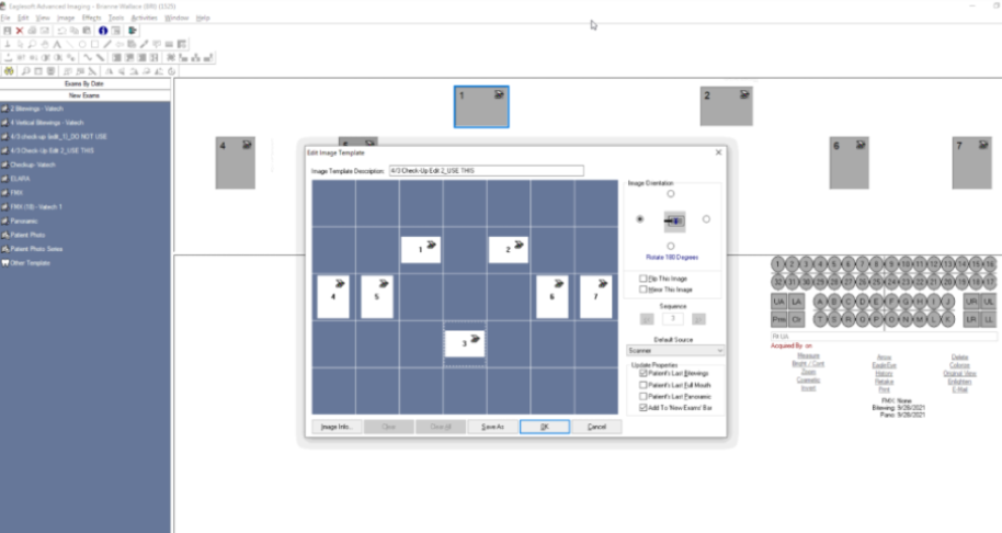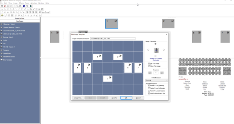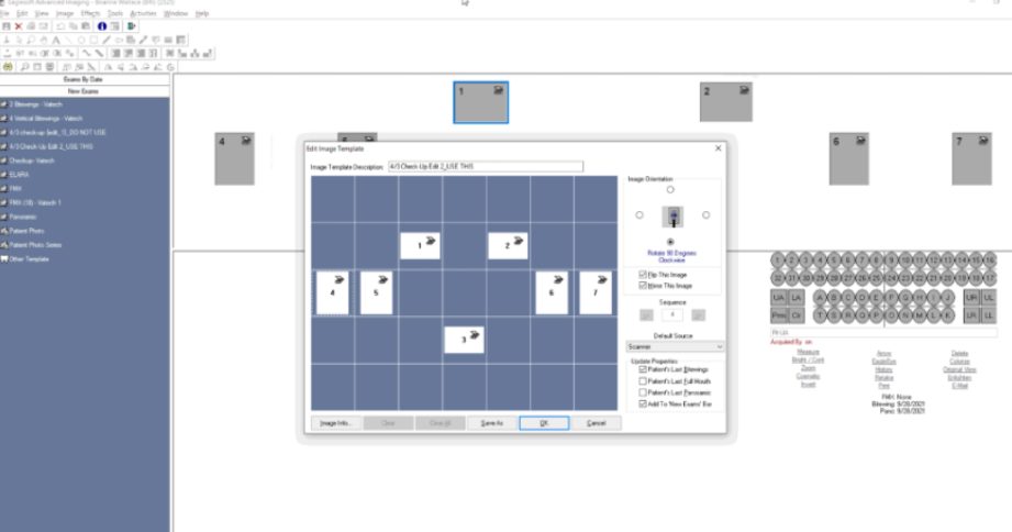 In these templates, a “Custom Setup” can be done started in the top right where the mounting squares can be manually added to the grid. The “Default Source” will always need to be “Scanner” for our Vatech IOX TWAIN driver. Every box will need to have the “Flip This Image” and “Mirror This Image” checkboxes enabled to ensure accurate orientation.