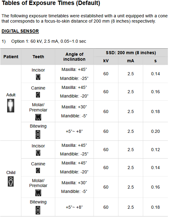 EzRay Air P: Portable Exposure Time table: